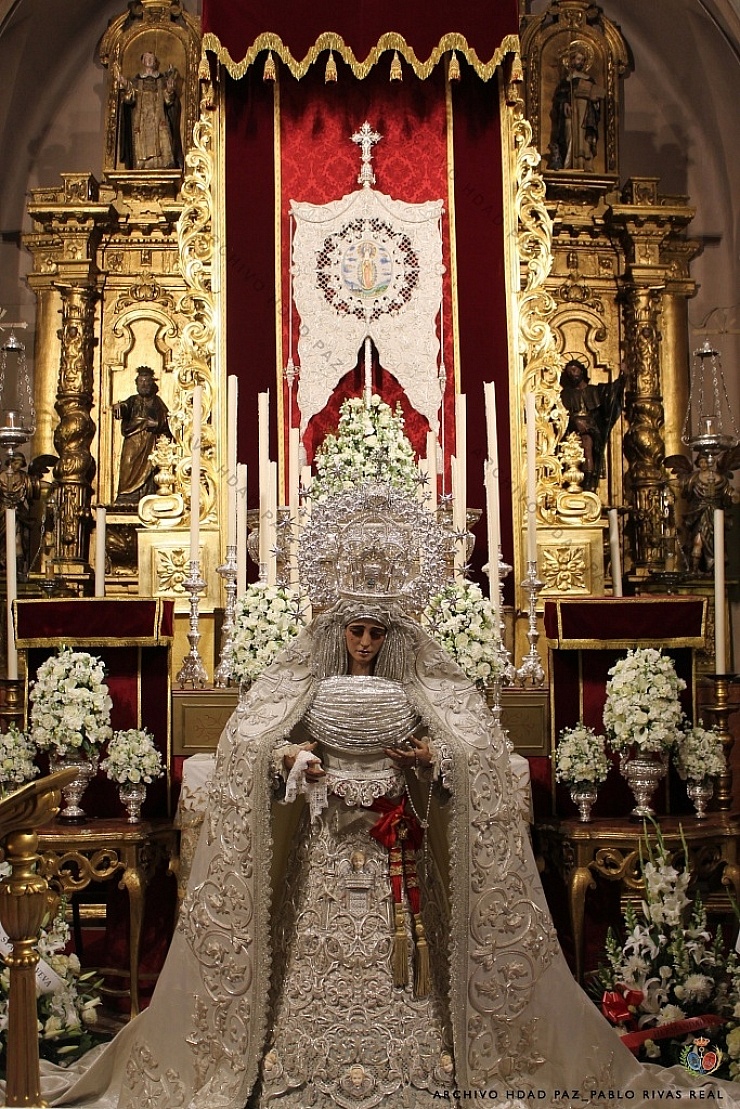 María Santísima de la Paz en Devoto Besamanos. La Virgen es ataviada con la saya neogótica diseñada y bordada por Manuel Solano Rodríguez entre los años 2013 y 2014.