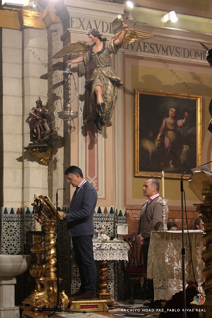 Nuestros Hermanos Juan Manuel Ochavo Castro y Andrés Pedro Jiménez Núñez hacen lectura del evangelio en el segundo día de Quinario en honor a Ntro. Padre Jesús de la Victoria.