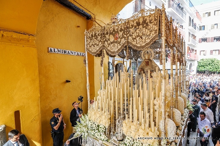 María Santísima de la Paz atraviesa el arco del Postigo, adentrándose al barrio del Arenal. Domingo de Ramos 2019.